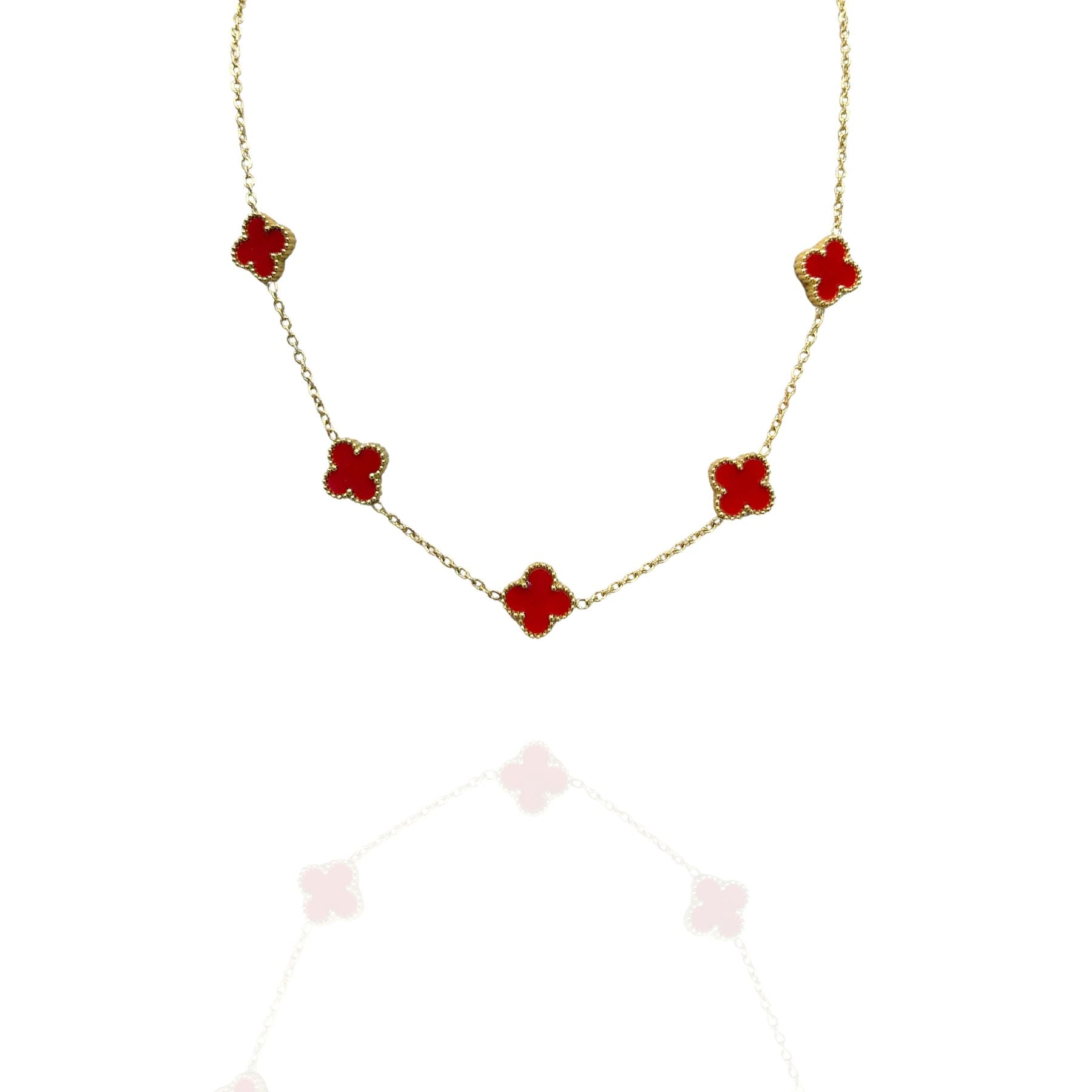 Colar Trevo 5 folhas vermelho com Dourado - Aço Inox